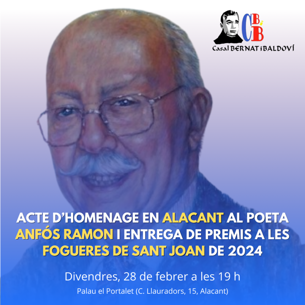 Al mateix temps, se celebrarà un acte d’homenage al poeta Anfós Ramon i Garcia, en el marc de l’any Anfós Ramon, que commemora el centenari del seu naiximent. Es descobrirà un llibret de foguera inèdit, escrit del seu puny i lletra en els anys 40, durant elseu servici militar en Alacant, i s’aprofitarà per a llegir alguns poemes dedicats a la nostra ciutat per este emblemàtic poeta en llengua valenciana.