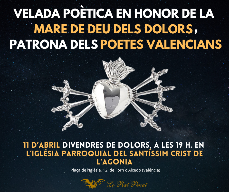 El pròxim divendres dia 11 d’abril, Lo Rat Penat celebrarà el tradicional acte poètic en honor a la Mare de Deu dels Dolors, Patrona dels Poetes Valencians. L’acte tindrà lloc a partir de les 19 h en l’Iglésia Parroquial del Santíssim Crist de l’Agonia (Forn d’Alcedo) de Valéncia (Plaça de l’Iglésia, 12).